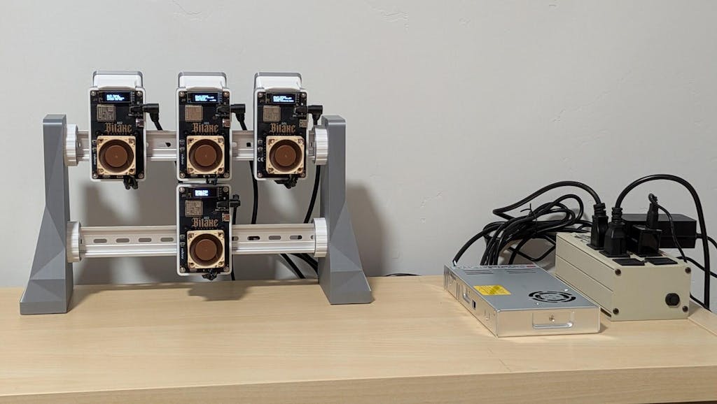 Transform your desktop mining setup with the BitTrak Desktop, a sleek, 3D-printed rack designed to securely hold multiple Bitaxe devices. Available in two sizes—15.5" wide for up to 6 units or 17.5" wide for up to 8 units—it’s built for compact efficiency. The innovative cog system allows flexible positioning, with a straight 90-degree vertical setup or customizable tilt at 22.5-degree increments for optimal accessibility and airflow.